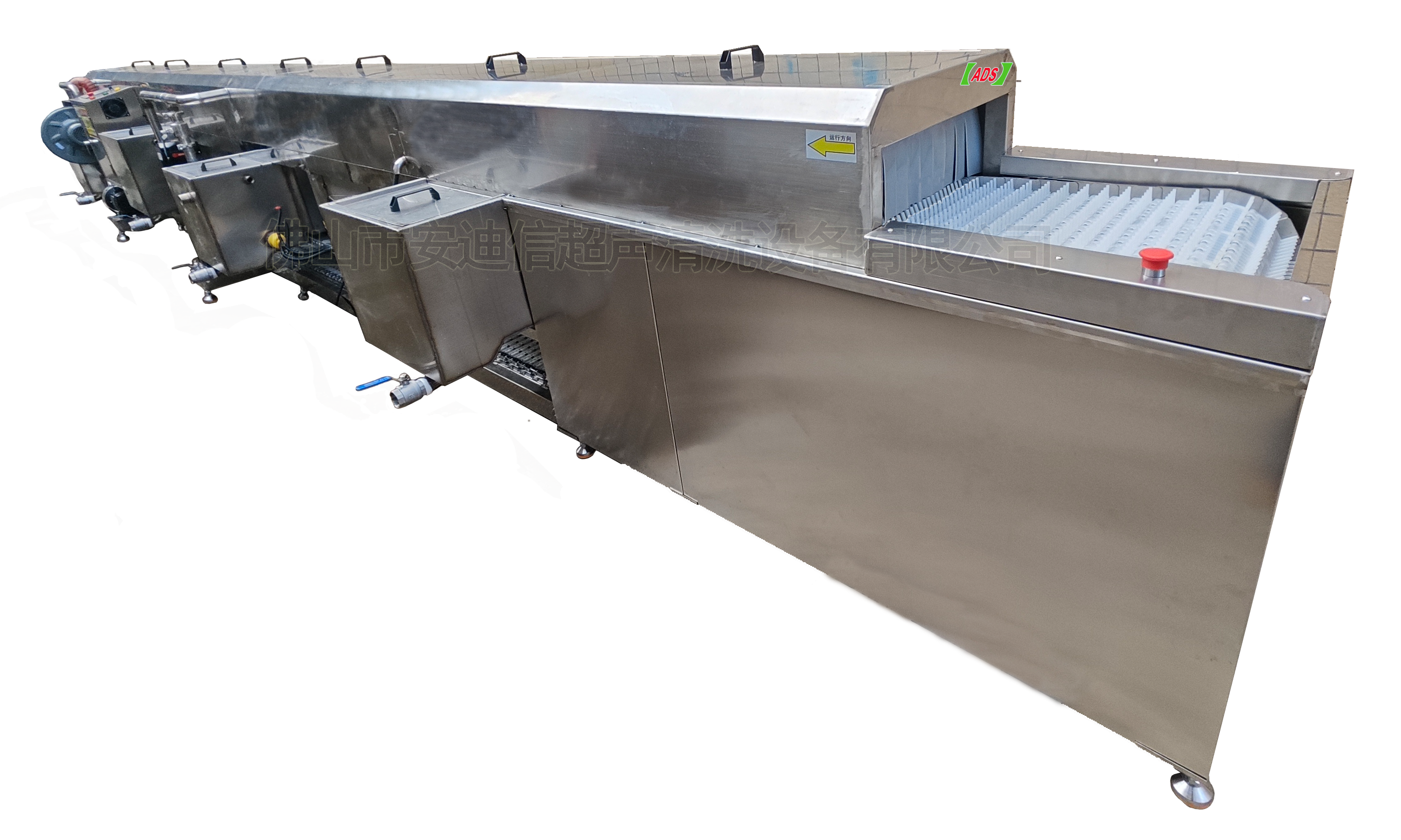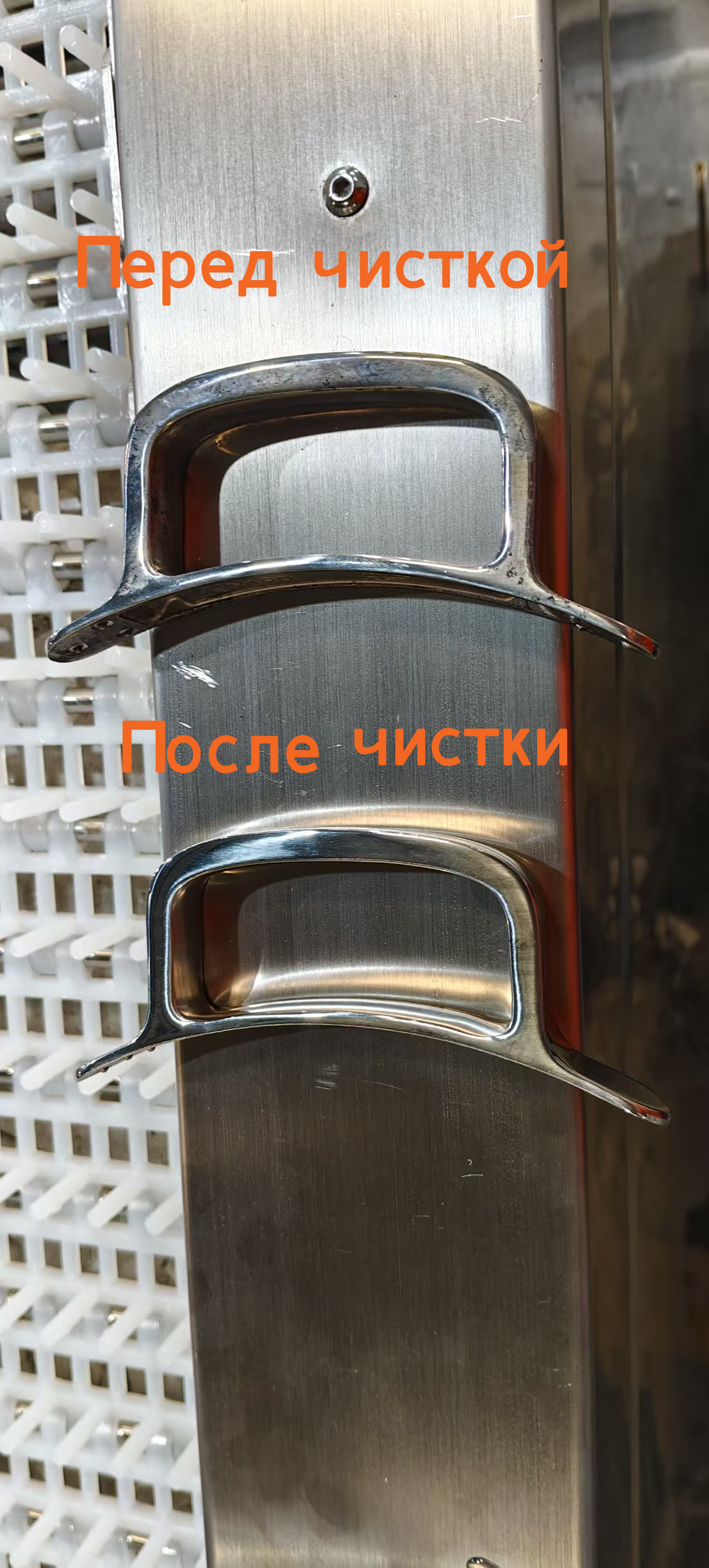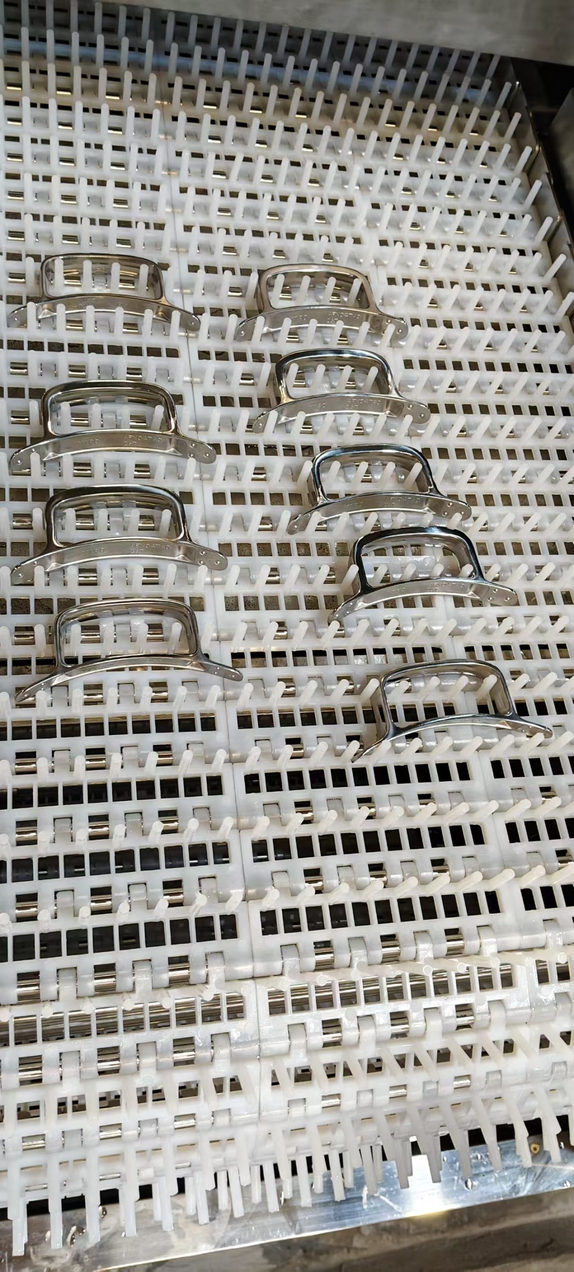 Линия очистки с сетчатым ленточным конвейером для мойки больших объемов ручек и захватов из нержавеющей стали; моечная машина с четырьмя резервуарами.