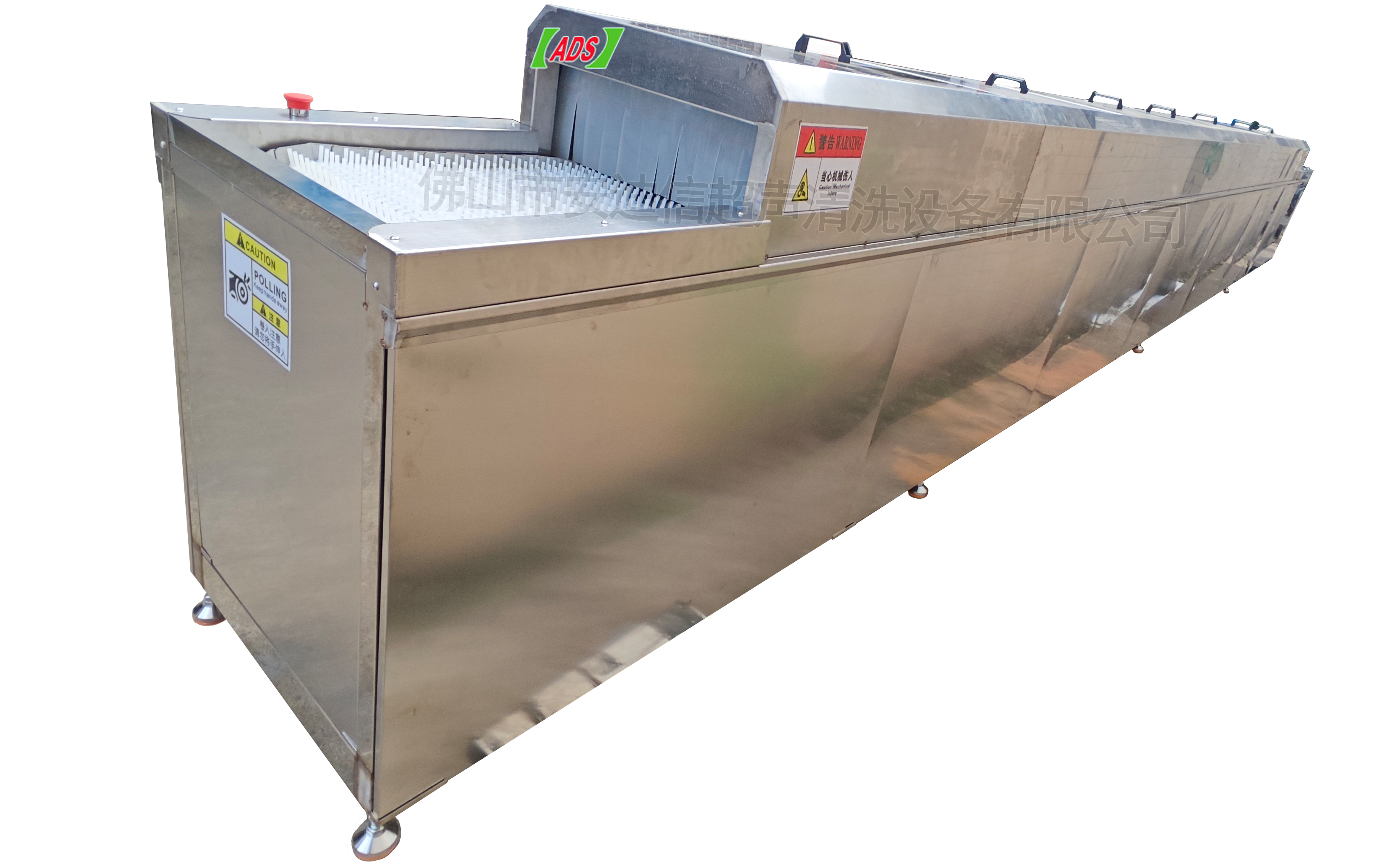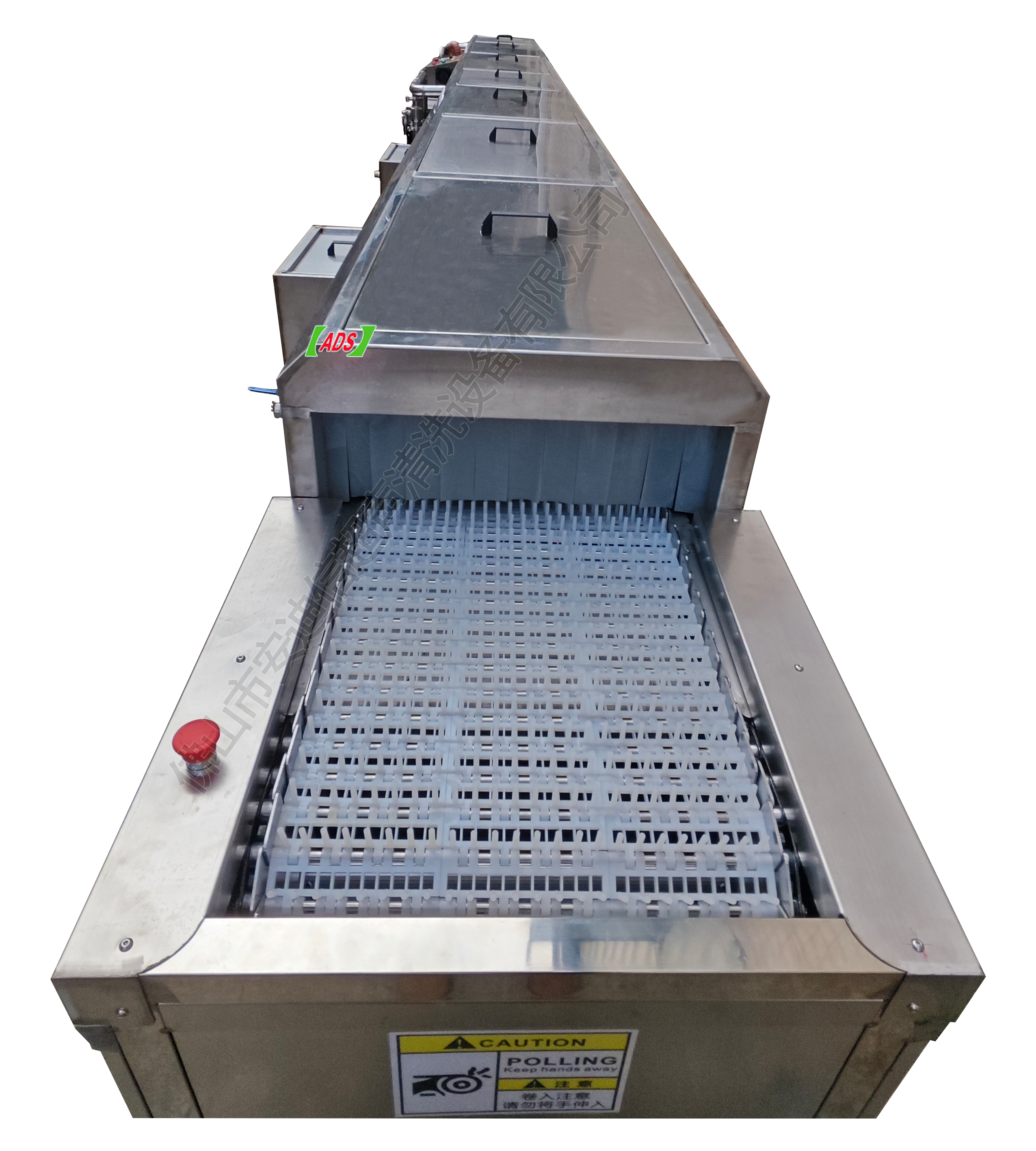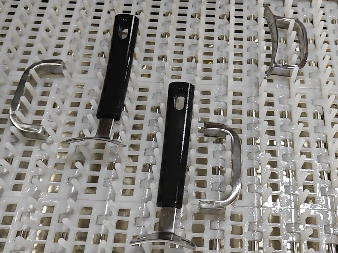 Линия очистки с сетчатым ленточным конвейером для мойки больших объемов ручек и захватов из нержавеющей стали; моечная машина с четырьмя резервуарами.